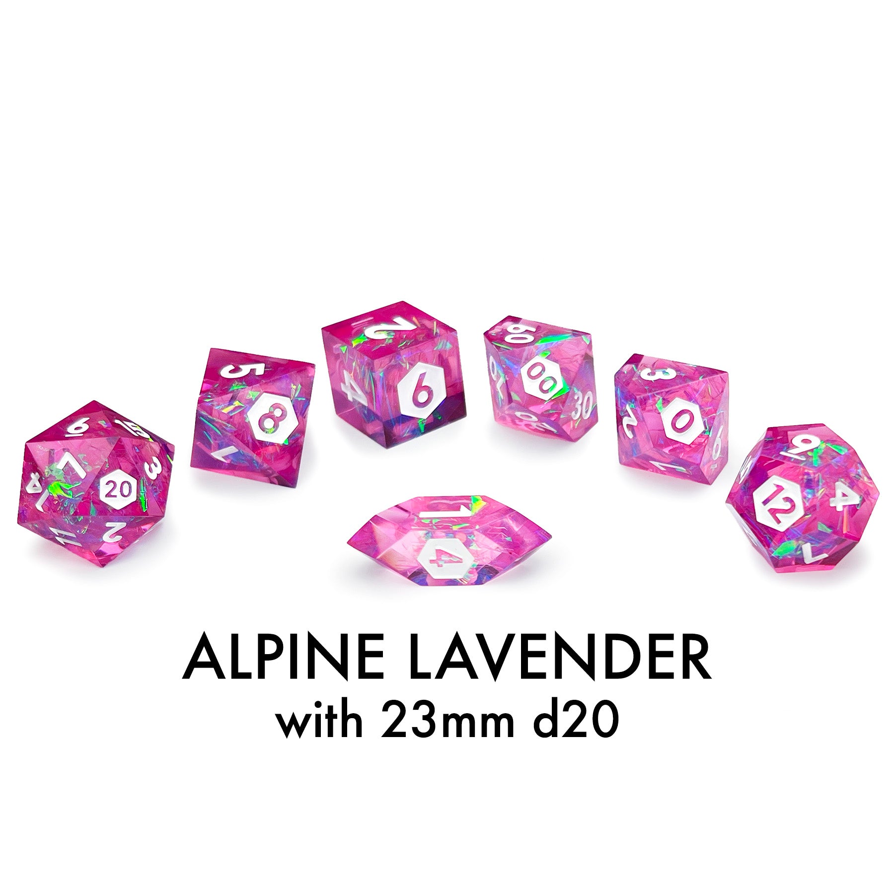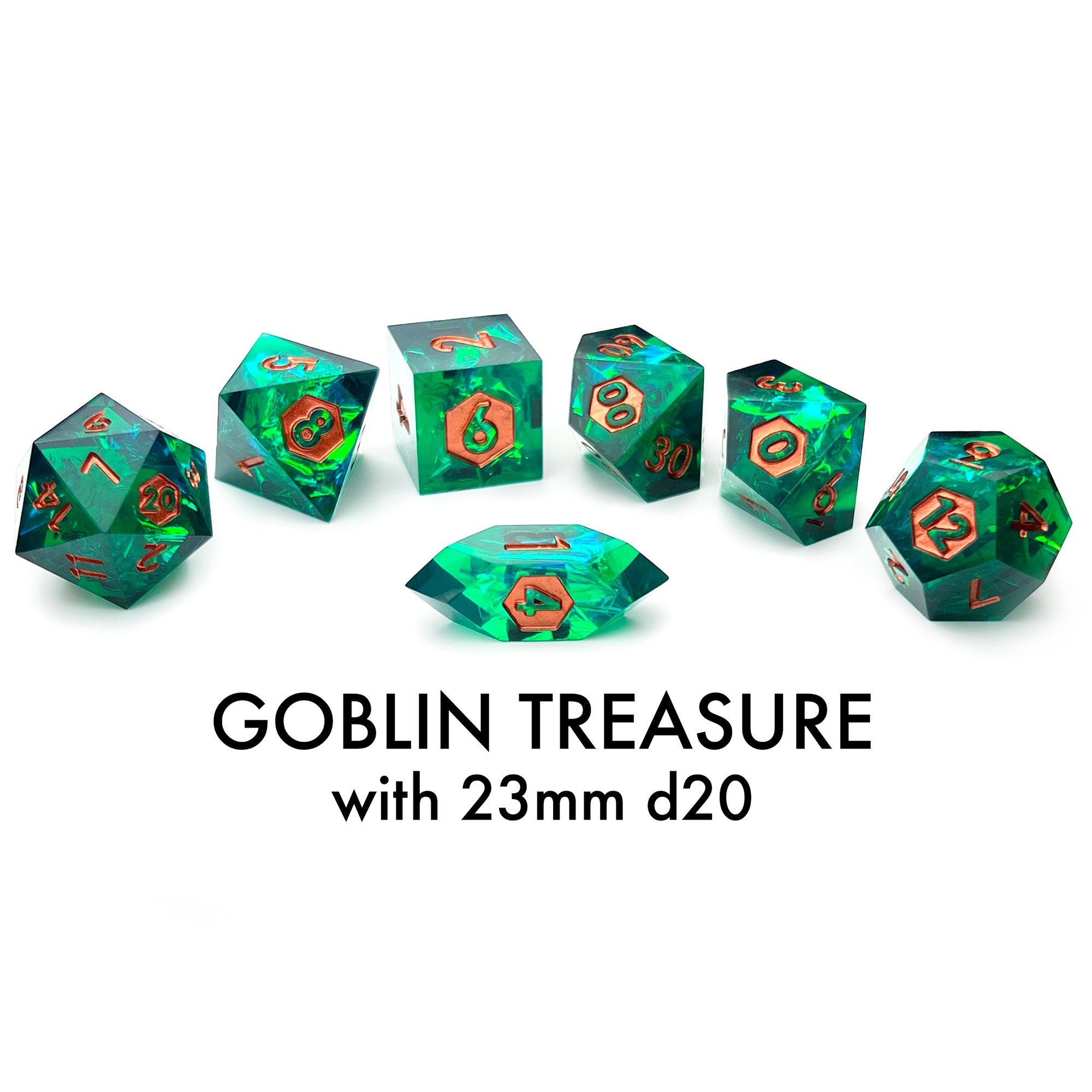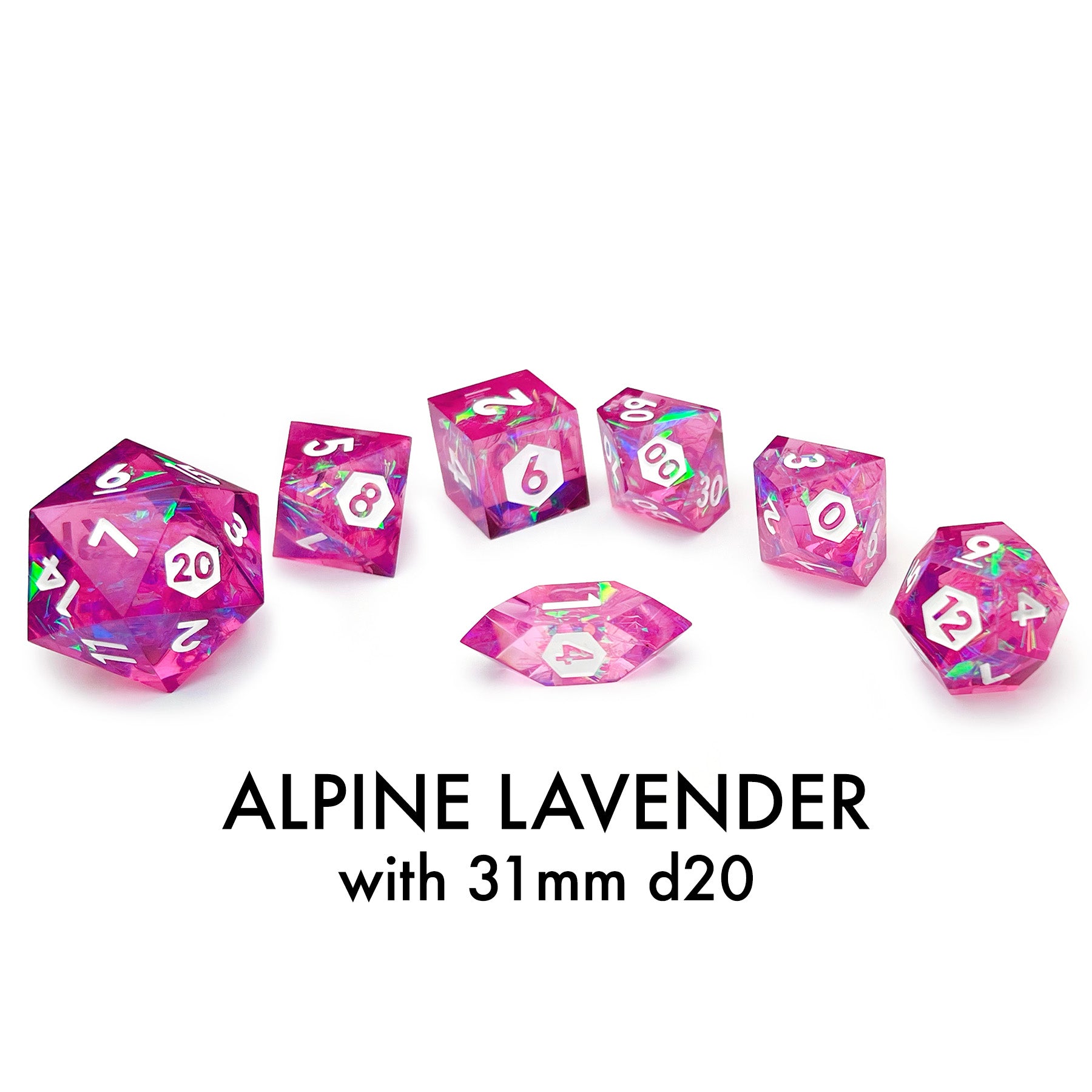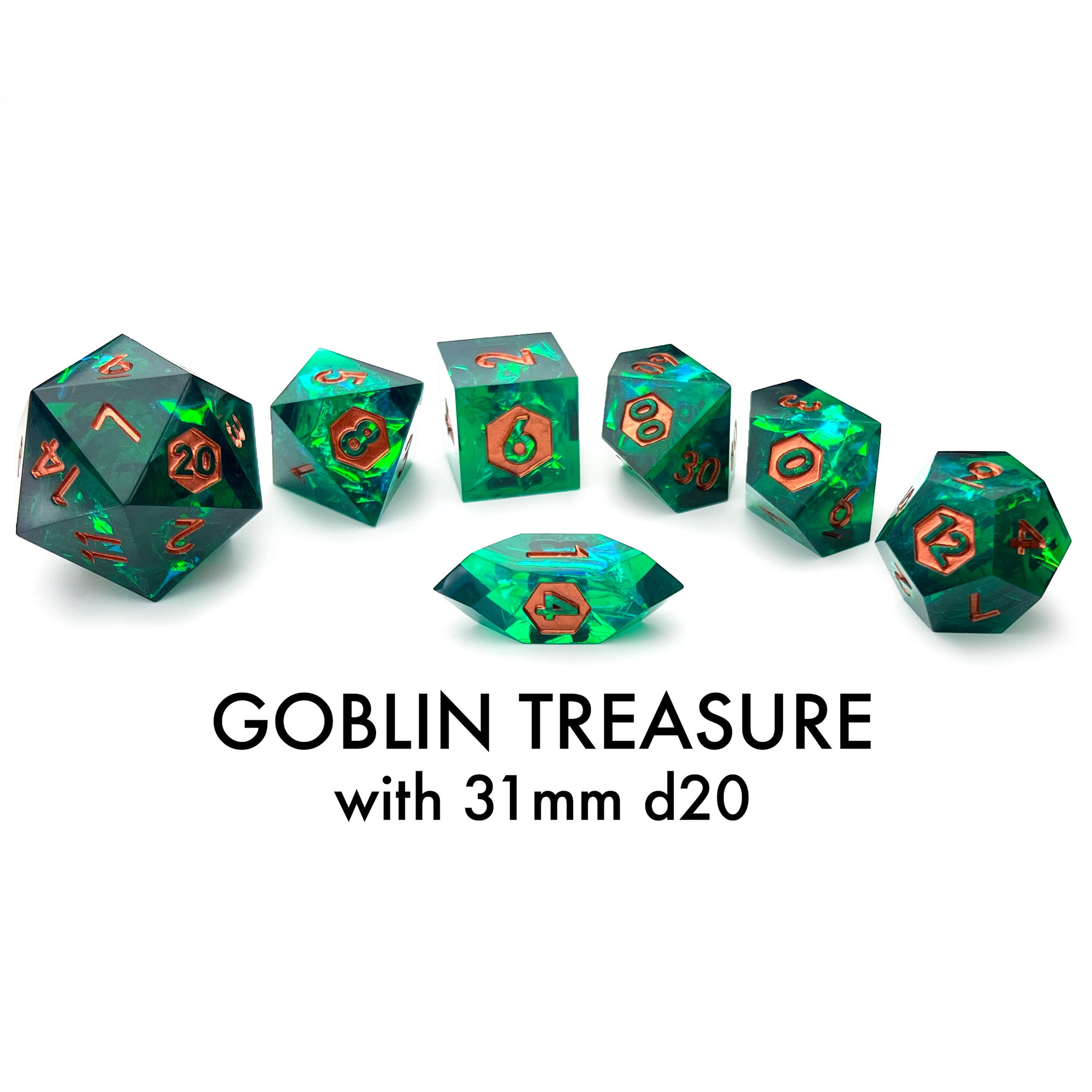 Hand Poured Sharp Edge Resin: These resin dice are poured by hand into silicone molds in order to achieve crisp sharp edges and to allow for the mix of colors and inclusions that give these dice their beauty. The dice are then hand polished and paint is carefully applied by hand to every single number. It is a long and complex process that requires highly skilled craftspeople.