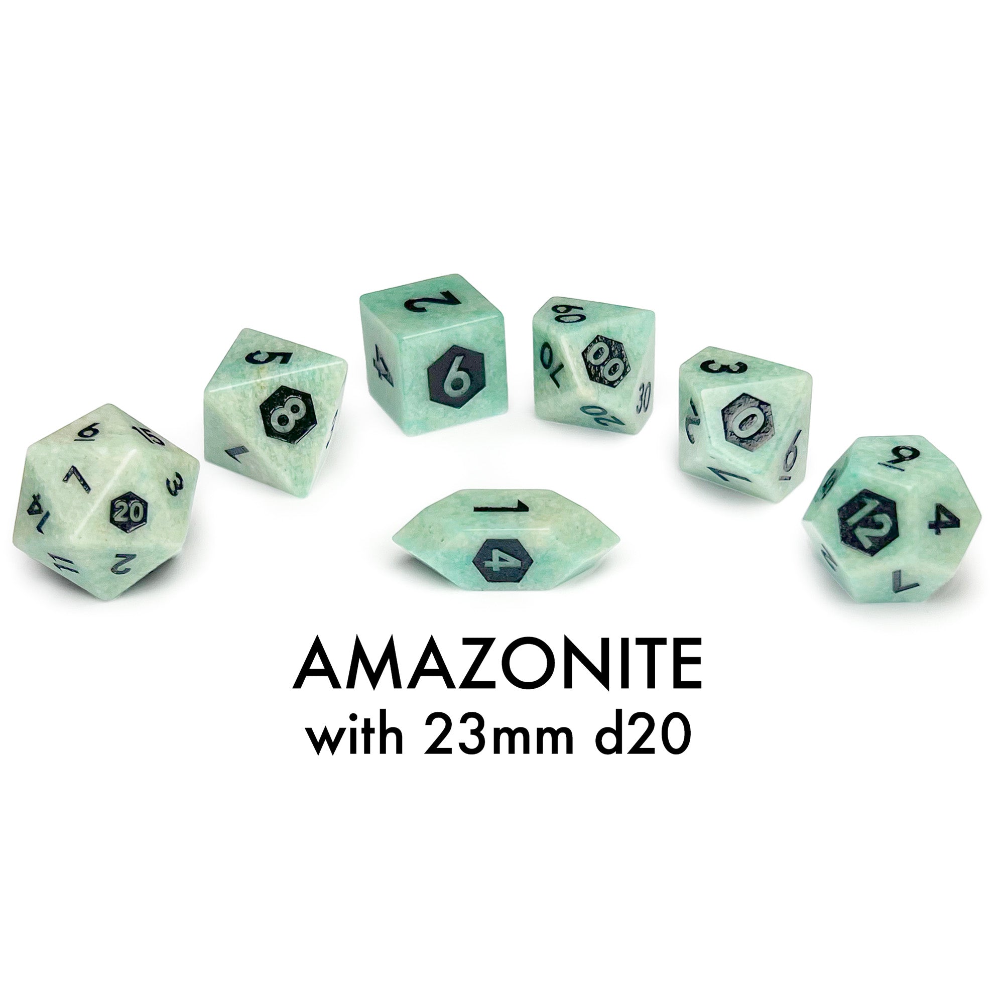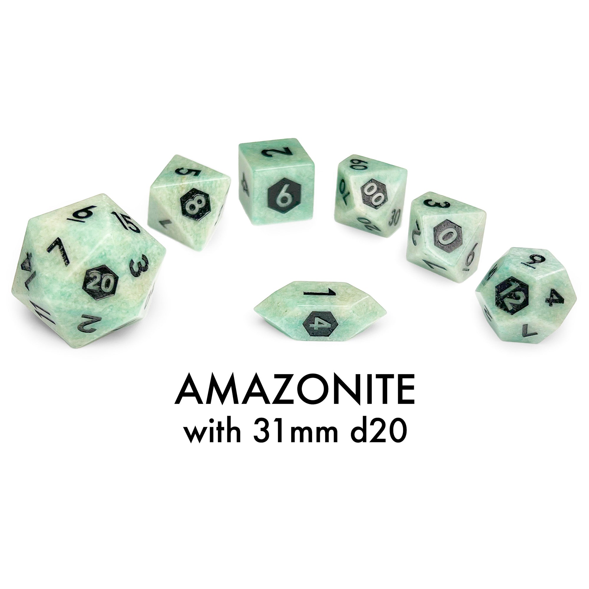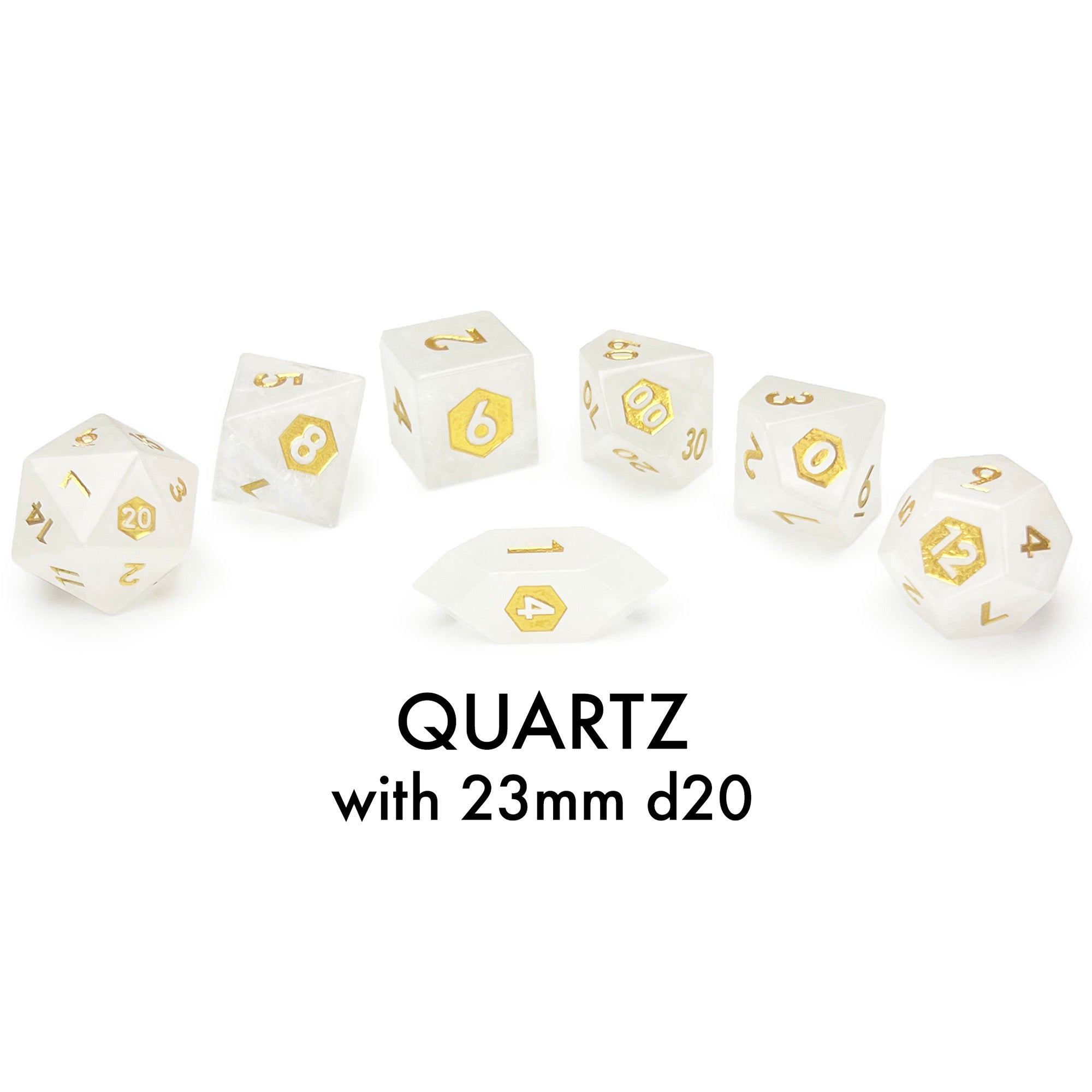 Gemstone Dice: These dice are hewn from solid semi-precious stone. Choose between Amethyst, Amazonite, or Quartz. Gemstone sets provide the ultimate luxury experience and a stunning addition to any collection.