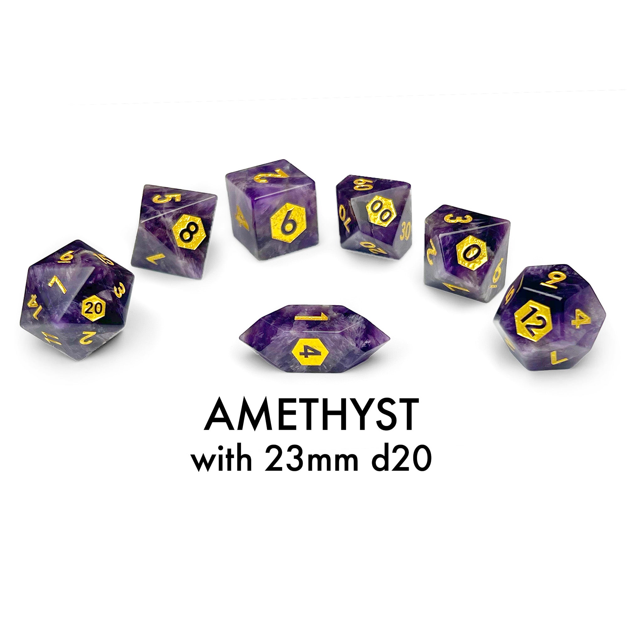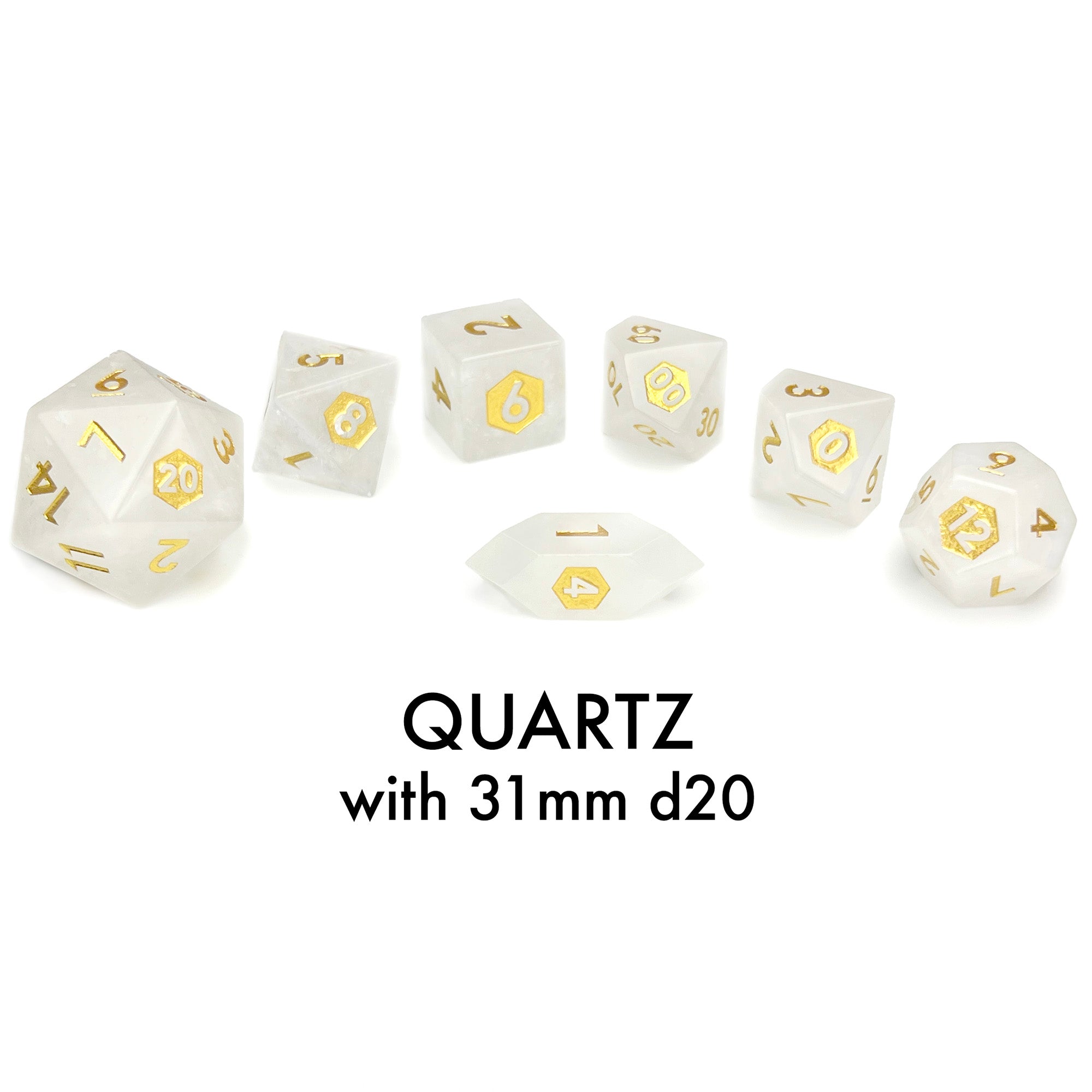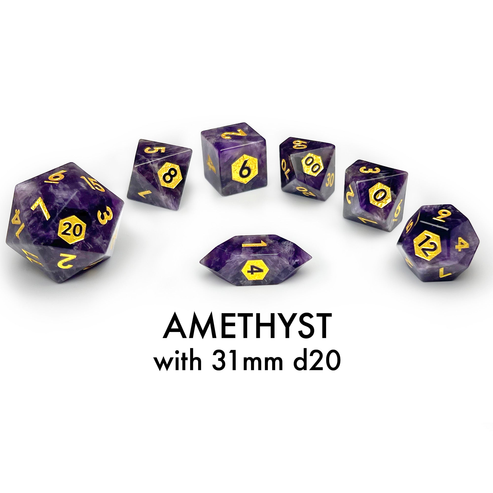 Gemstone Dice: These dice are hewn from solid semi-precious stone. Choose between Amethyst, Amazonite, or Quartz. Gemstone sets provide the ultimate luxury experience and a stunning addition to any collection.
