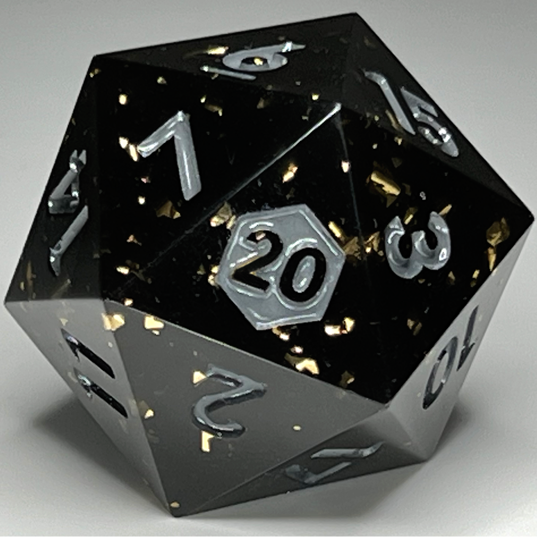 Hand Poured Sharp Edge Resin: These resin dice are poured by hand into silicone molds in order to achieve crisp sharp edges and to allow for the mix of colors and inclusions that give these dice their beauty. The dice are then hand polished and paint is carefully applied by hand to every single number. It is a long and complex process that requires highly skilled craftspeople.