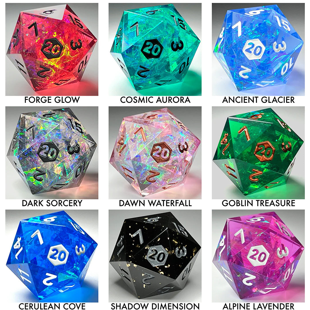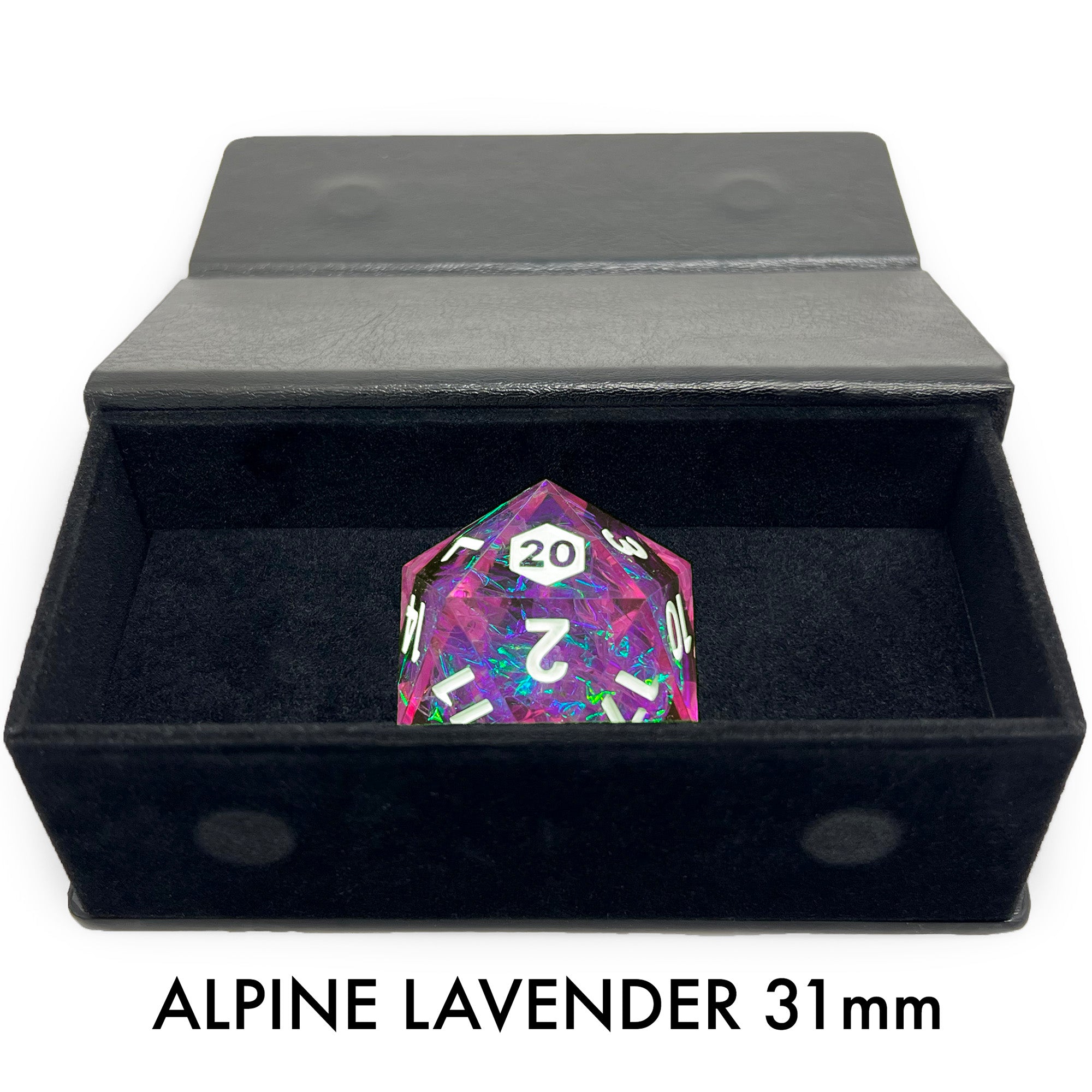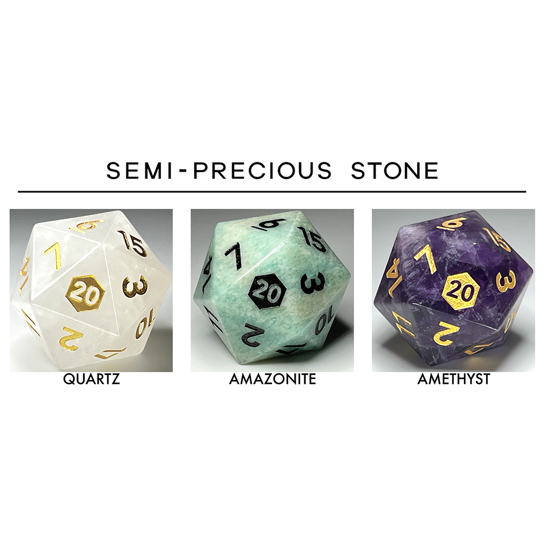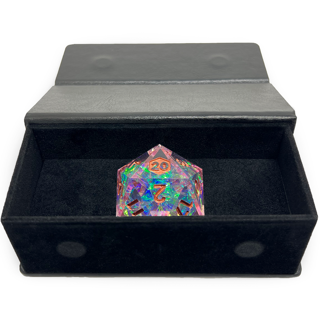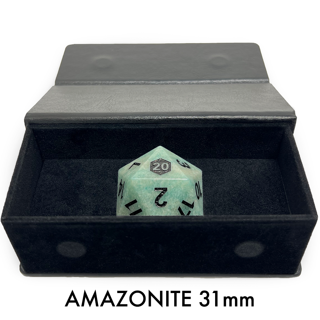A single 31mm d20 in the color or stone of your choice nestled in an elegant case.