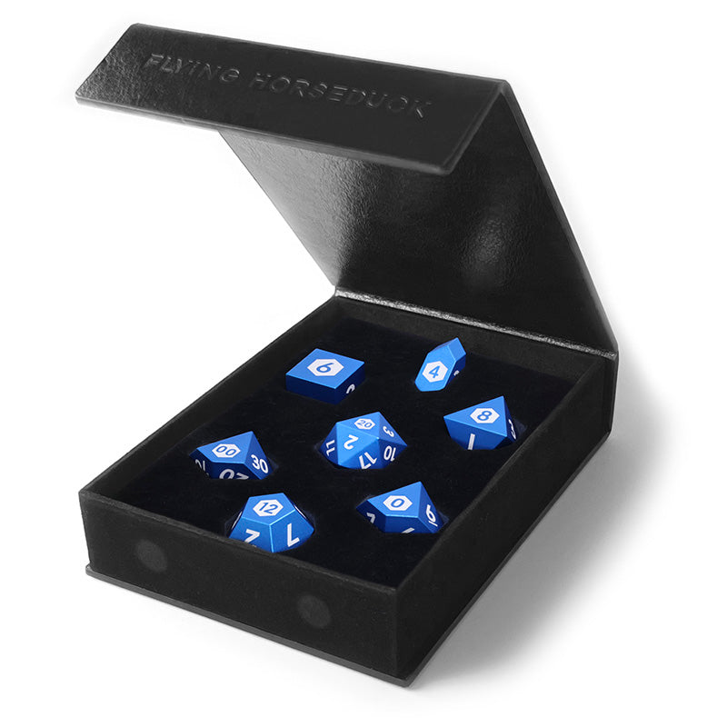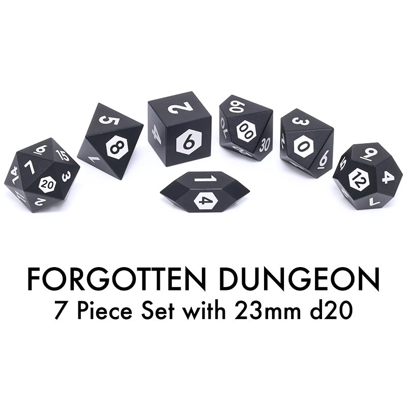 A set of seven polyhedral dice, each precisely milled from 7075-T651 Aluminum by machinists using a 5-axis CNC. The dice feature permanently laser marked numbers arranged in a mathematically balanced layout. Comes with an elegant case for storage and display.