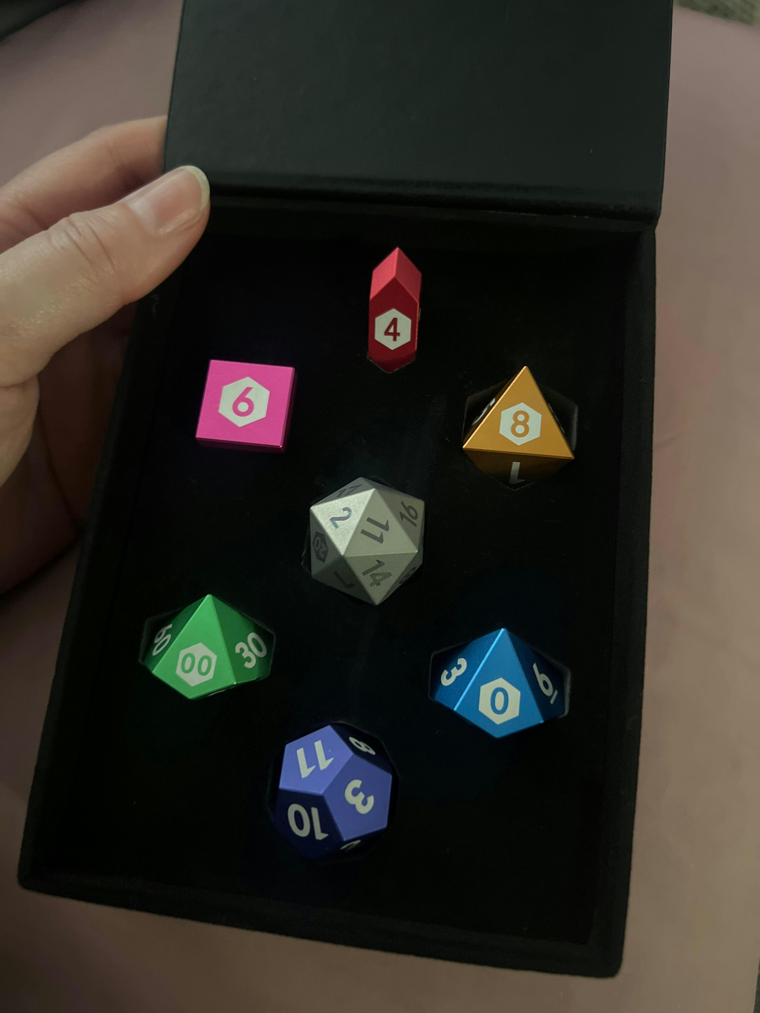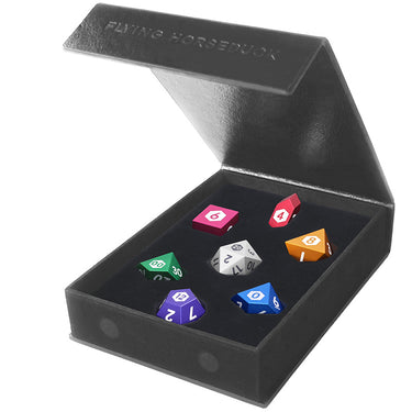 Each of the dice feature permanently laser marked numbers arranged in a mathematically balanced layout. The colors are as picture below (Titanium d20, purple d12, green d00/d%, blue d10, gold d8, pink d6, red d4). Comes with an elegant case for storage and display.