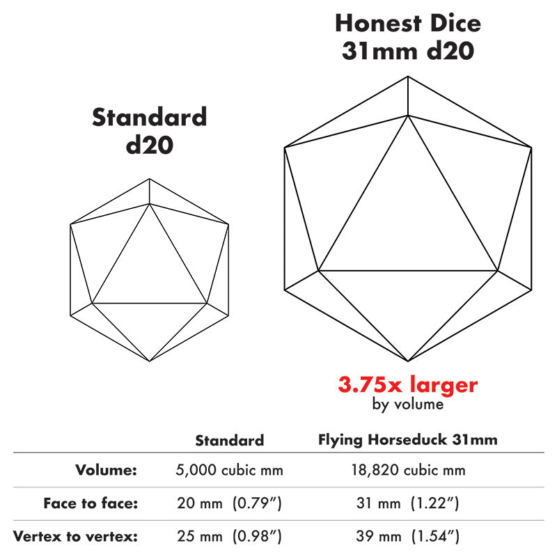 Size: I like my dice a bit bigger. By volume these dice are 40-50% larger than the standard versions.