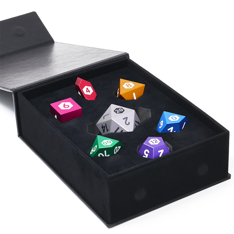 Each of the dice feature permanently laser marked numbers arranged in a mathematically balanced layout. The colors are as picture below (Titanium d20, purple d12, green d00/d%, blue d10, gold d8, pink d6, red d4). Comes with an elegant case for storage and display.