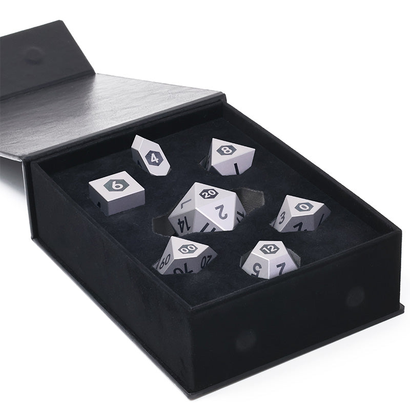 A set of seven polyhedral dice, including a massive 31mm d20. Each die is precisely milled from solid Ti-6Al-4V Titanium by machinists using a 5-axis CNC. They feature permanently laser marked numbers arranged in a mathematically balanced layout. Comes with an elegant case for storage and display.