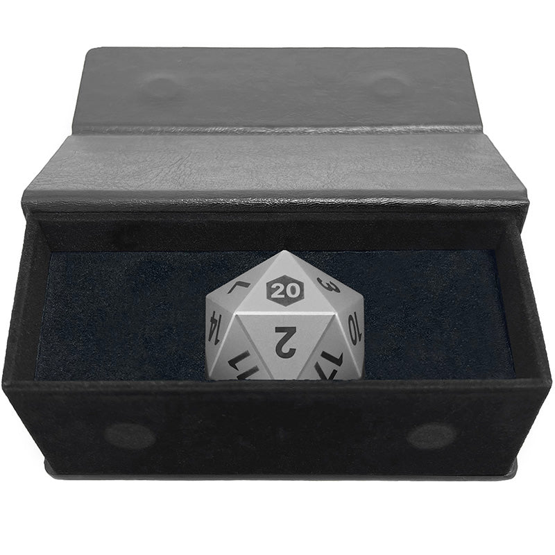 A massive 31mm d20 precisely milled from solid Ti-6Al-4V Titanium by machinists using a 5-axis CNC. It features permanently laser marked numbers arranged in a mathematically balanced layout. Includes an elegant case for storage and display.
