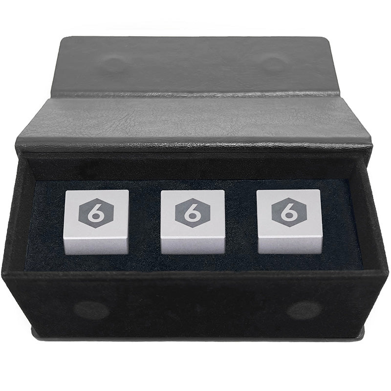 These dice are over 65% larger than standard d6s by volume. Each die measures 19mm from face to opposite face and features permanently laser marked numbers arranged in a mathematically balanced layout. Includes an elegant case for storage and display.